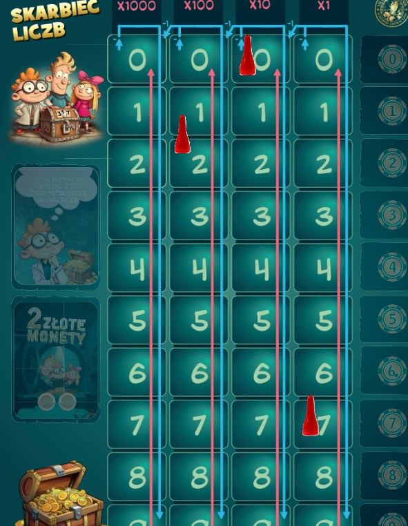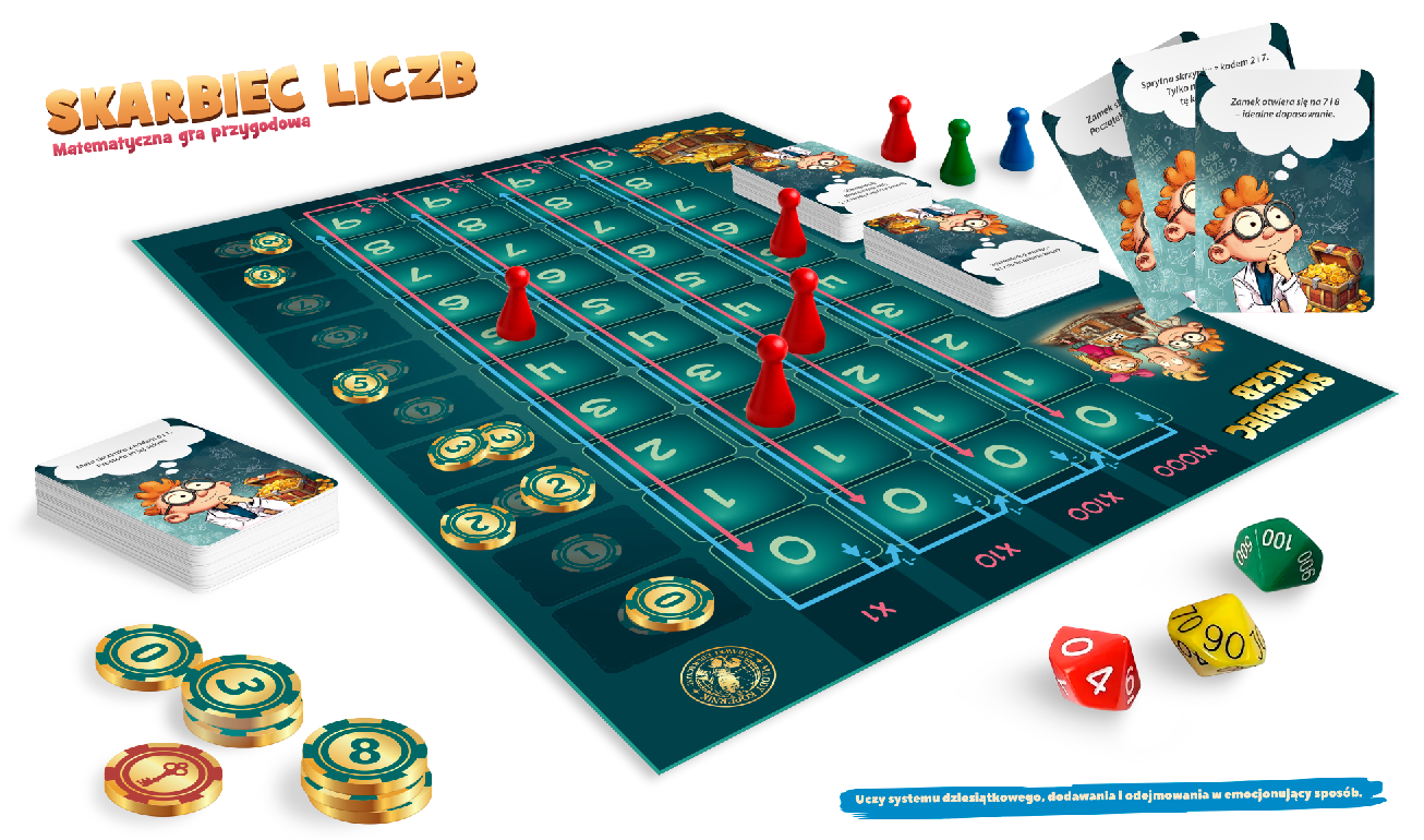 Grupa poszukiwaczy rywalizuje o skrzynie pełne złota - ale by je otworzyć, musisz zdobyć tajemnicze kody liczbowe! Rzucaj kostkami, planuj dodawanie lub odejmowanie na torach jedności, dziesiątek, setek i tysięcy! Zbieraj cyfry to klucze do skrzyń pełnych złota! Zwycięży ten, kto najszybciej zgromadzi najwięcej bogactw i sprytnie wykorzysta moc liczb! Gra zaprojektowana do wspomagania nauki działań matematycznych.